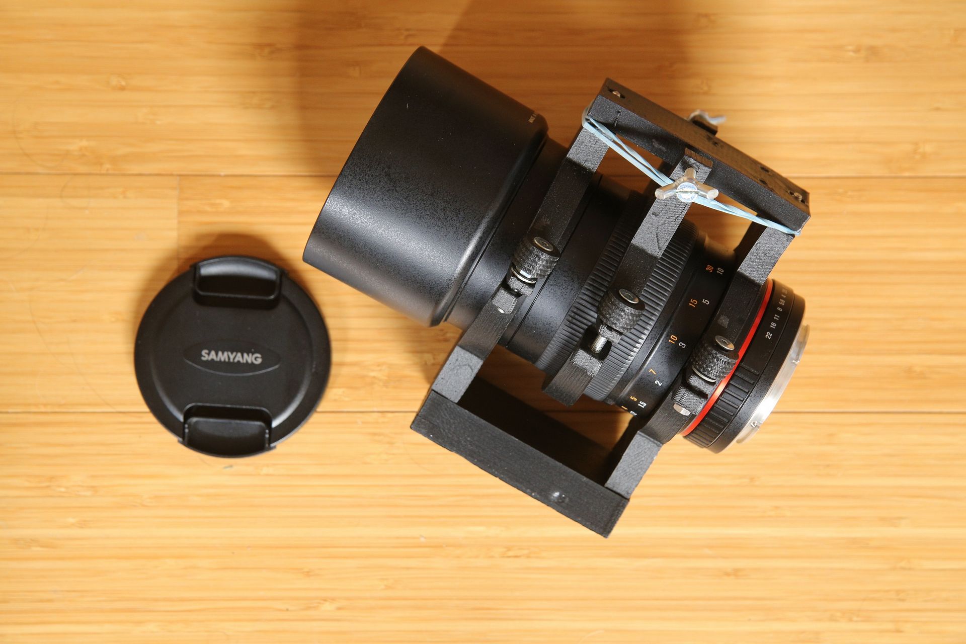 Het gaat natuurlijk om een puur manuele lens (geen autofocus dus, gebruiken we toch niet in astrofotografie), waar bovendien met behulp van 3D-printing een extra fijnregeling op geplaatst werd om het scherpstellen nog nauwkeuriger te maken. Dit is ook voorzien van een "zwaluwstaart" zodat de telelens rechtstreeks op een volgmontering kan geplaatst worden (en dus niet via de camera zelf, wat voor een beter evenwicht zorgt).