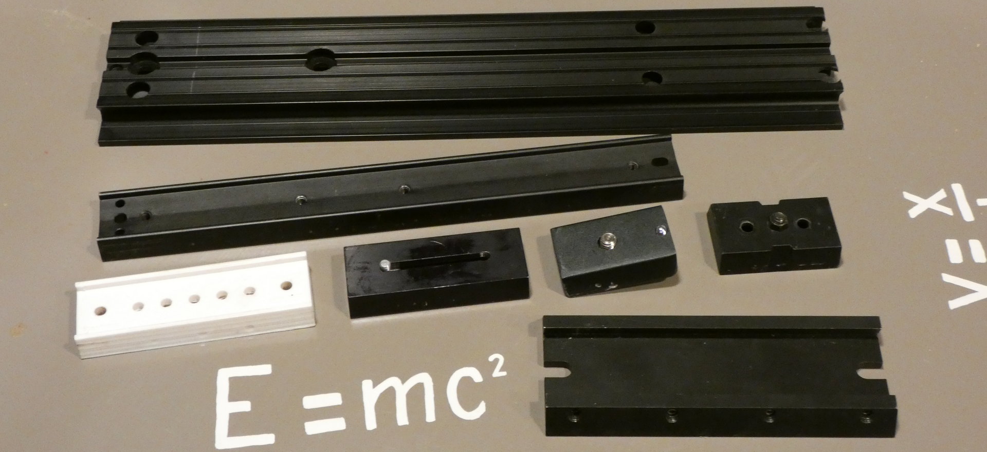 De verschillende soorten zwaluwstaarten - om een telescoop snel en vlot te bevestigen op zijn montering: bovenaan de robuustere "Losmandy"-style voor de allerzwaarste telescopen, in het midden een aantal voorbeelden van de meer courante Vixen-style (en onderaan een verloopstuk om die laatste om te toveren naar de brede versie).