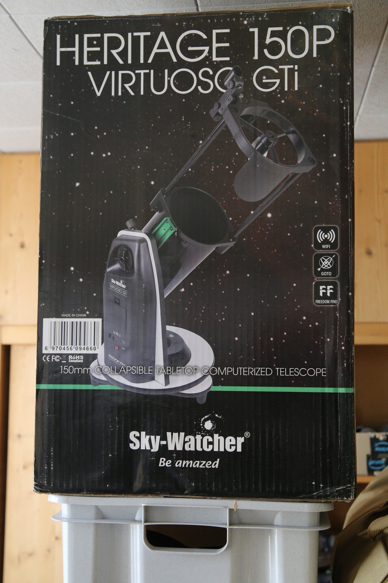 Kort daarna stond er opnieuw een doos aan de deur: een showroom-exemplaar (dus tweedehands, maar quasi ongebruikt) van deSkywatcher 150P Virtuoso GTi. Een hele mondvol, maar eigenlijk een kleine uitschuifbare newtontelescoop gemonteerd op een geautomatiseerd onderstel. Een beetje een futuristische uitvoering van de aloude dobsontelescoop dus!